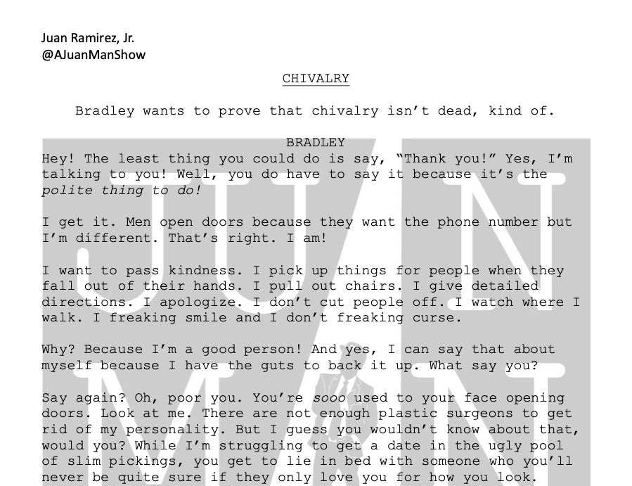 Use: Monologues are to be use for auditions, educational and showcase purposes. All monologues posted on social media, websites and all other public outlets must credit: