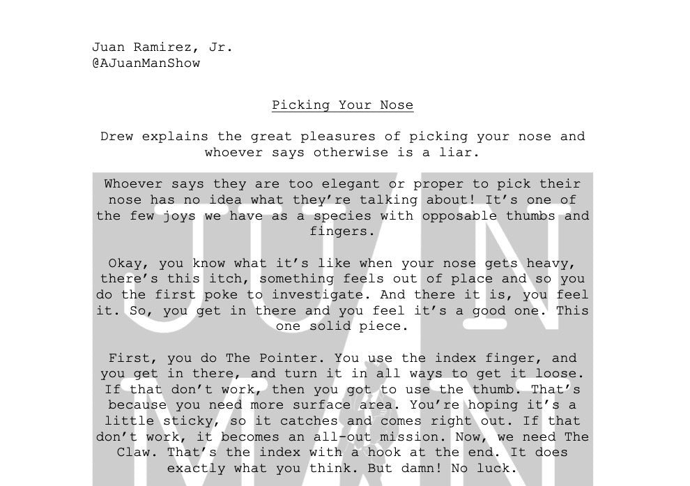 Synopsis: Drew explains the great pleasures of picking your nose and whoever says otherwise is a liar.