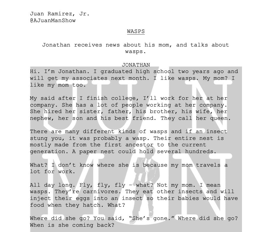 Use: Monologues are to be use for auditions, educational and showcase purposes. All monologues posted on social media, websites and all other public outlets must credit: