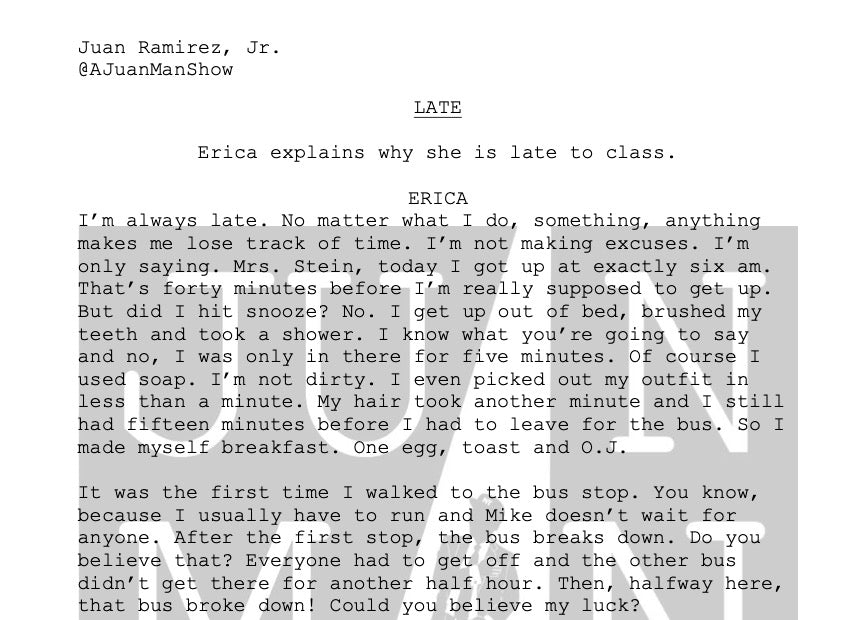 Use: Monologues are to be use for auditions, educational and showcase purposes. All monologues posted on social media, websites and all other public outlets must credit: