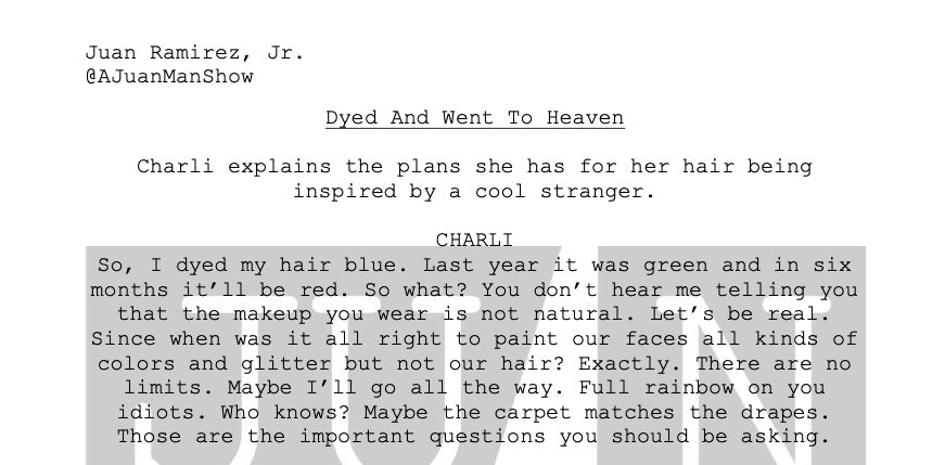 Use: Monologues are to be use for auditions, educational and showcase purposes. All monologues posted on social media, websites and all other public outlets must credit: