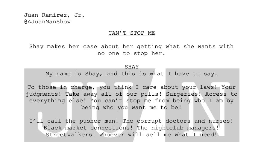 Use: Monologues are to be use for auditions, educational and showcase purposes. All monologues posted on social media, websites and all other public outlets must credit: