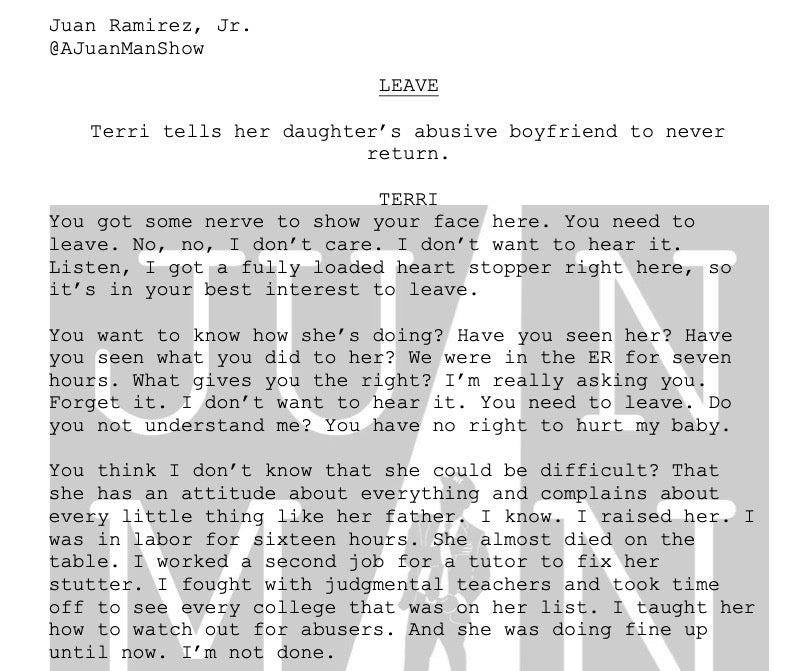 Use: Monologues are to be use for auditions, educational and showcase purposes. All monologues posted on social media, websites and all other public outlets must credit: