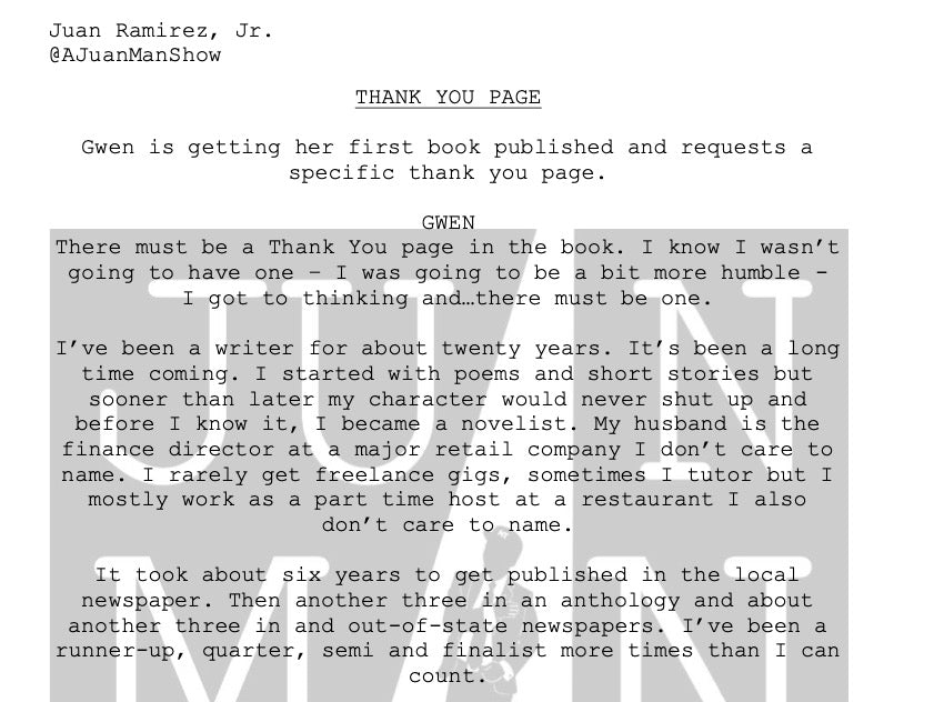 Synopsis: Gwen is getting her first book published and requests a specific thank you page.