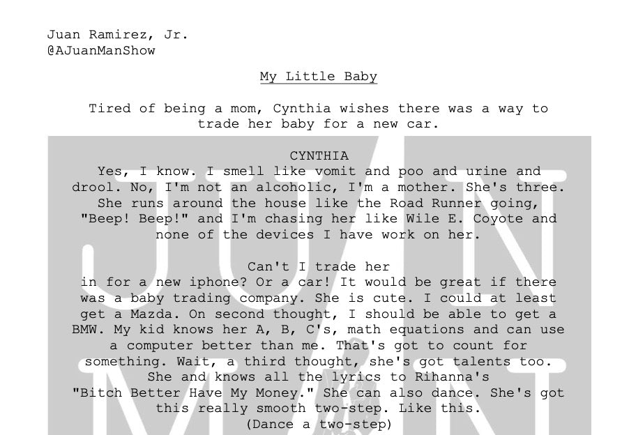 Use: Monologues are to be use for auditions, educational and showcase purposes. All monologues posted on social media, websites and all other public outlets must credit: